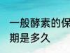 1、一般酵素的保质期有两年左右。2、酵素是由活细胞产生的具有催化活性和高度选择性的特殊蛋白质。按其组成的不同,将酶分成单纯蛋白质和 ....