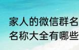 1、铿锵一族2、群英荟萃3、亲情无价4、家园群5、我爱我家6、一家人7、皇亲国戚8、三代同堂。9、花果山10、我们都是一家人11、我们一家都 ....